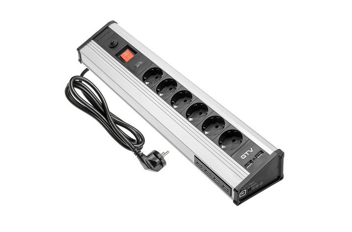 GTV AE-PBMUL6S6U-53 - настільний кутовий подовжувач з 6 роз'ємами SCHUKO, 4 USB-портами HUB, 2 портами USB 2.1A 5V. MAX-3500 Вт IP20 1,8 м дроту Робоча напруга: 220-240 В/50-60 Гц